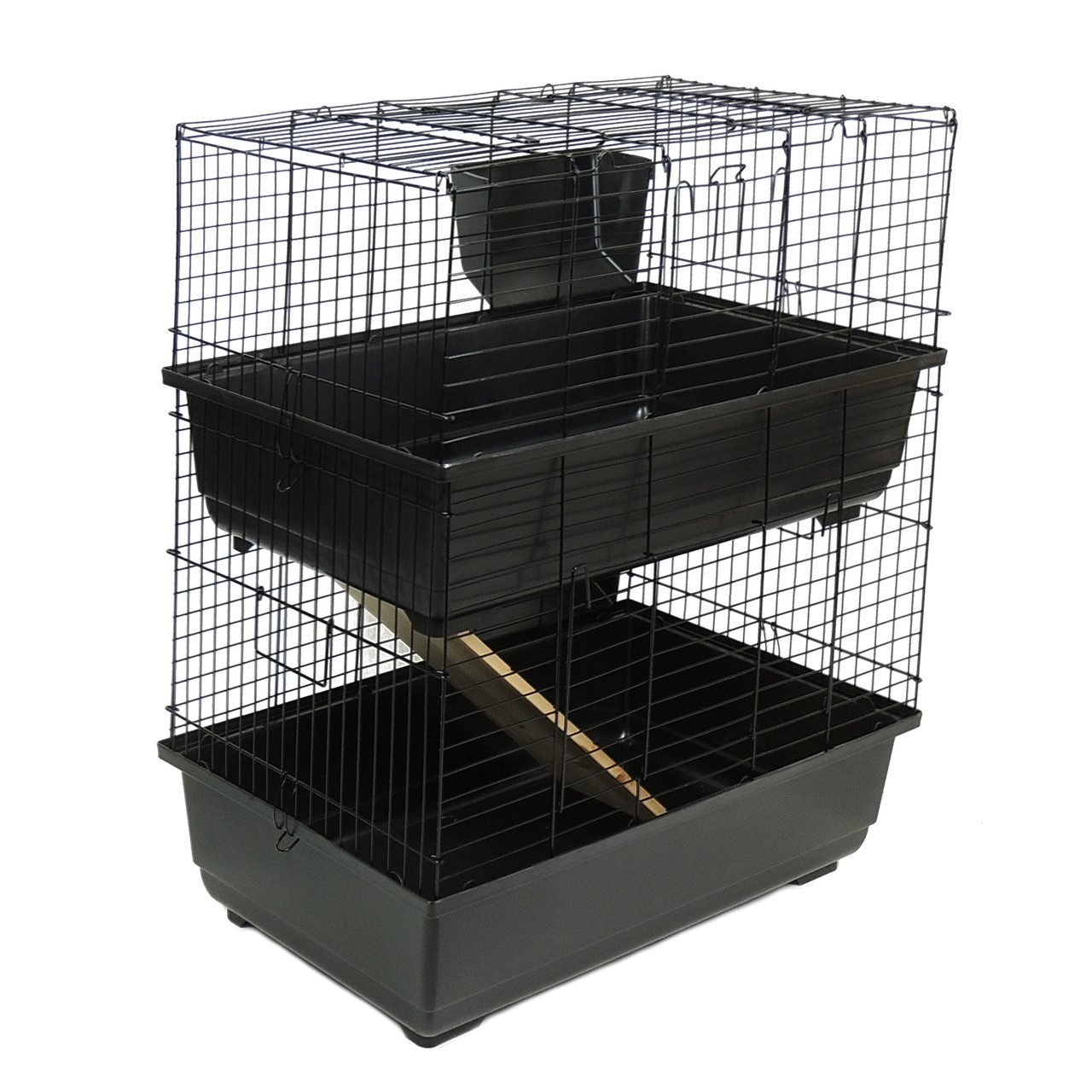 Rabbit 80cm Double Cage. Blue/Black base with black bars. Includes wooden heavy duty ramp and two hayracks. Three doors – two front opening and one top opening.