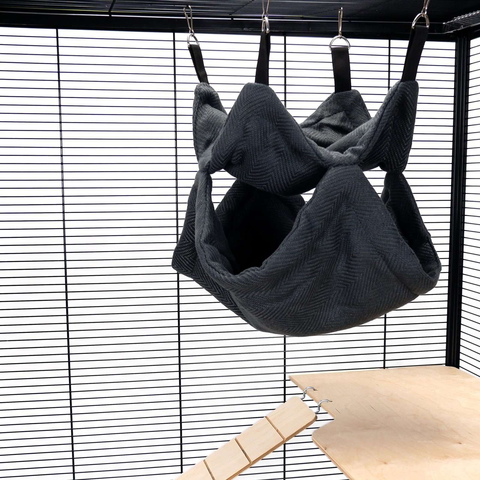 The Pet Rat Ferret Chinchilla Double Layer Bunkbed from Little Friends features a stylish grey weave design specifically created for small pets. This spacious bunkbed is one of the larger small animal items available, providing ample room for your furry friends to relax and play. Made from durable quilted material, it easily attaches to your pet’s cage with clips, offering a versatile resting space with both top and bottom layers for lounging and snuggling.