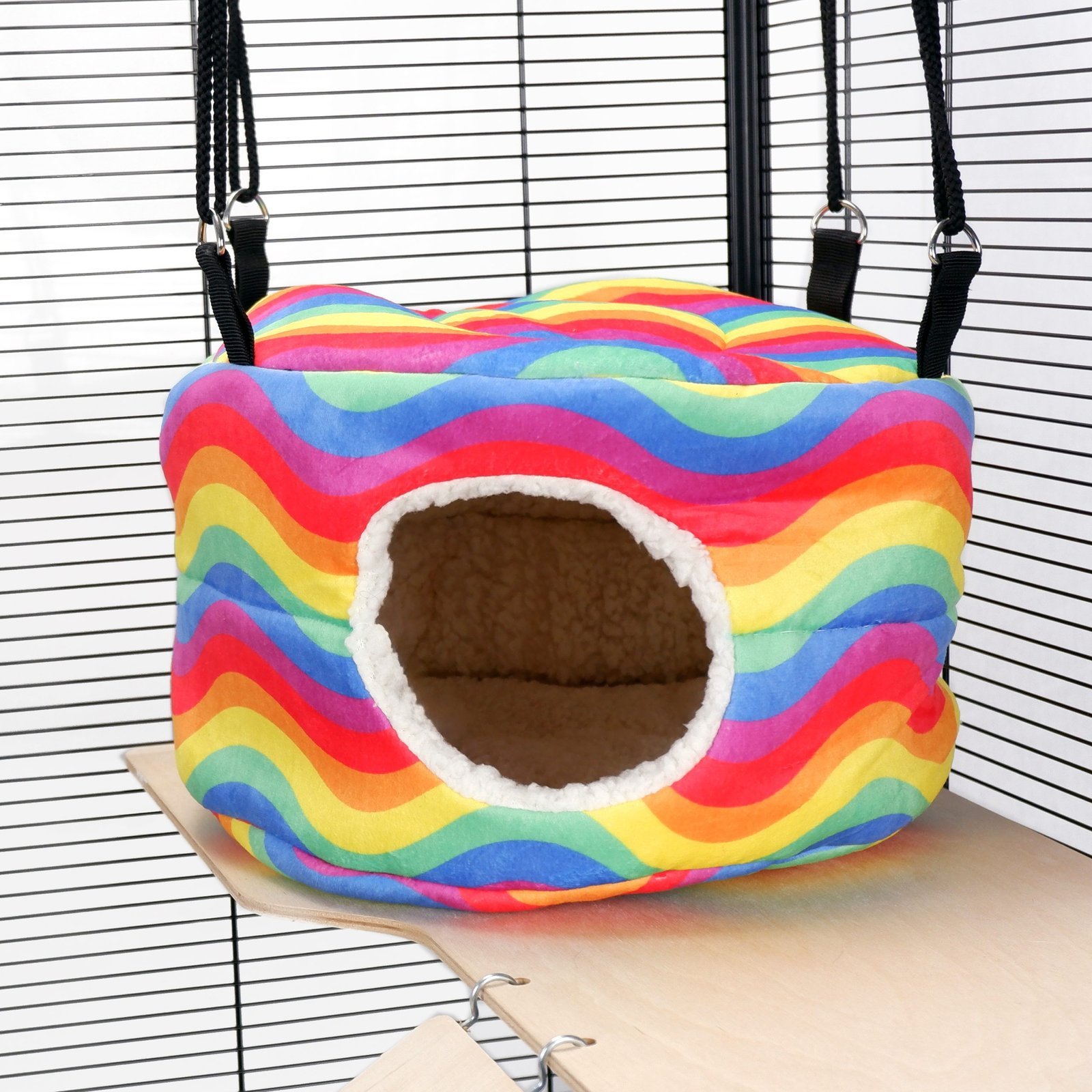 The Pet Rat Ferret Chinchilla HUGE Rodent-Hive Toy – Rainbow Waves from Little Friends is a versatile, colourful play solution for small pets. This spacious toy features a vibrant rainbow wave design and can be used either freestanding or attached to the top of a cage with the provided straps. Its generous size accommodates multiple pets simultaneously, making it an excellent addition to any small animal habitat.