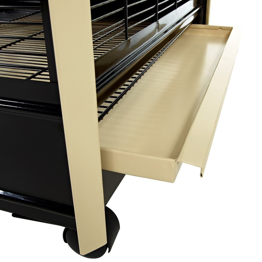 Pull out metal cleaning tray, removable wire floor. On castors for ease of movement.